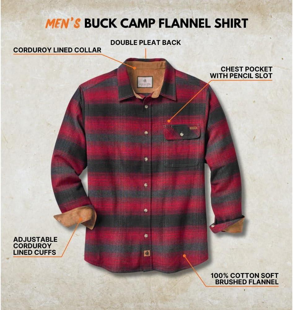 Our original single pocket flannel – The Buck Camp Flannel Shirt is the perfect weight to wear alone or layered over a t-shirt or under a shirt jacket. The traditional style and signature corduroy details offer unmatched durability, while the relaxed fit and brushed cotton flannel provide ultimate comfort. With multiple exclusive plaids and solids, they're suitable for any occasion from the woods to the office. The Buck Camp Flannel Shirt gives you an incredible “bang for your buck”! Big & Tall sizes are designed for men over 6'2″ and add 2″ in body length and 1-1⁄2″ in sleeve length.