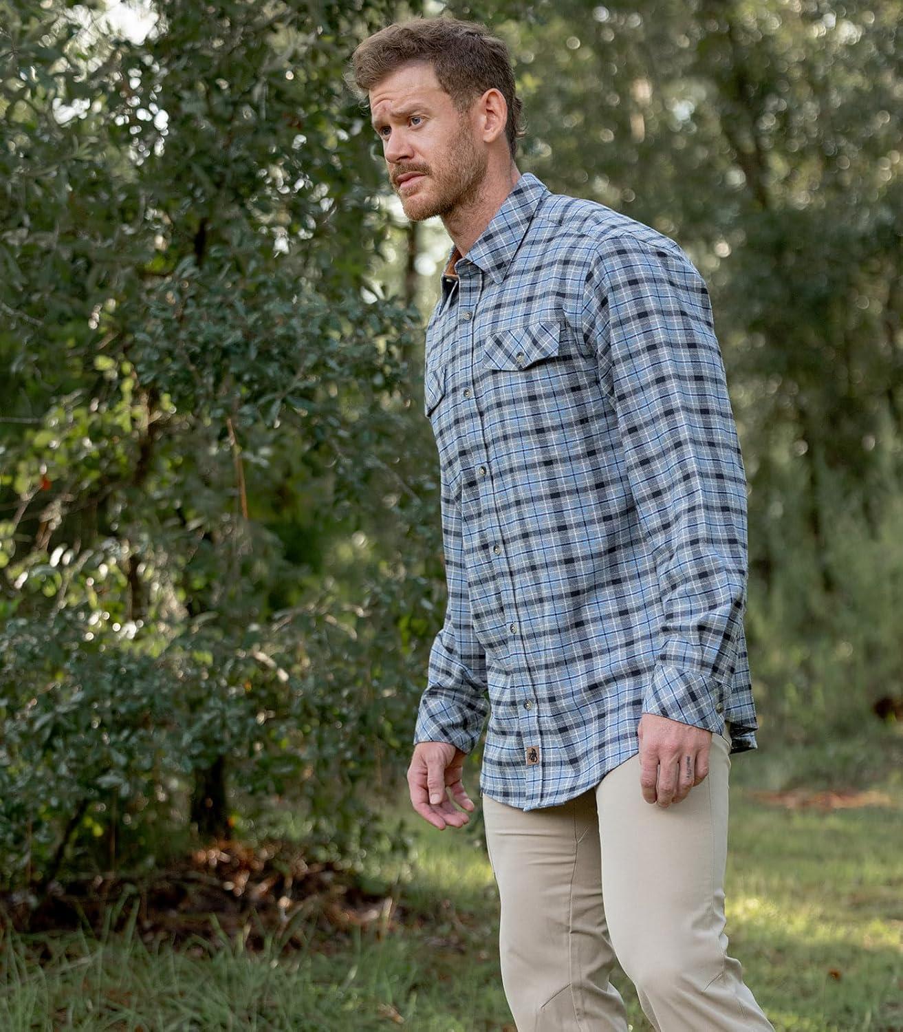 The Men's Legendary Flannel Shirt is the ultimate shirt for all your indoor and outdoor activities. We engineered it with the same relaxed fit as our other shirts, then raised the back yoke and added stretch to achieve a custom fit that gives you full range of motion without any tugging or pulling… even at full draw! Additional features include convertible pocket flaps that can be buttoned or tucked in, and super soft suede knit lined collar and cuffs. If you like our Buck Camp Flannel Shirt , you're going to love the new Legendary Flannel!