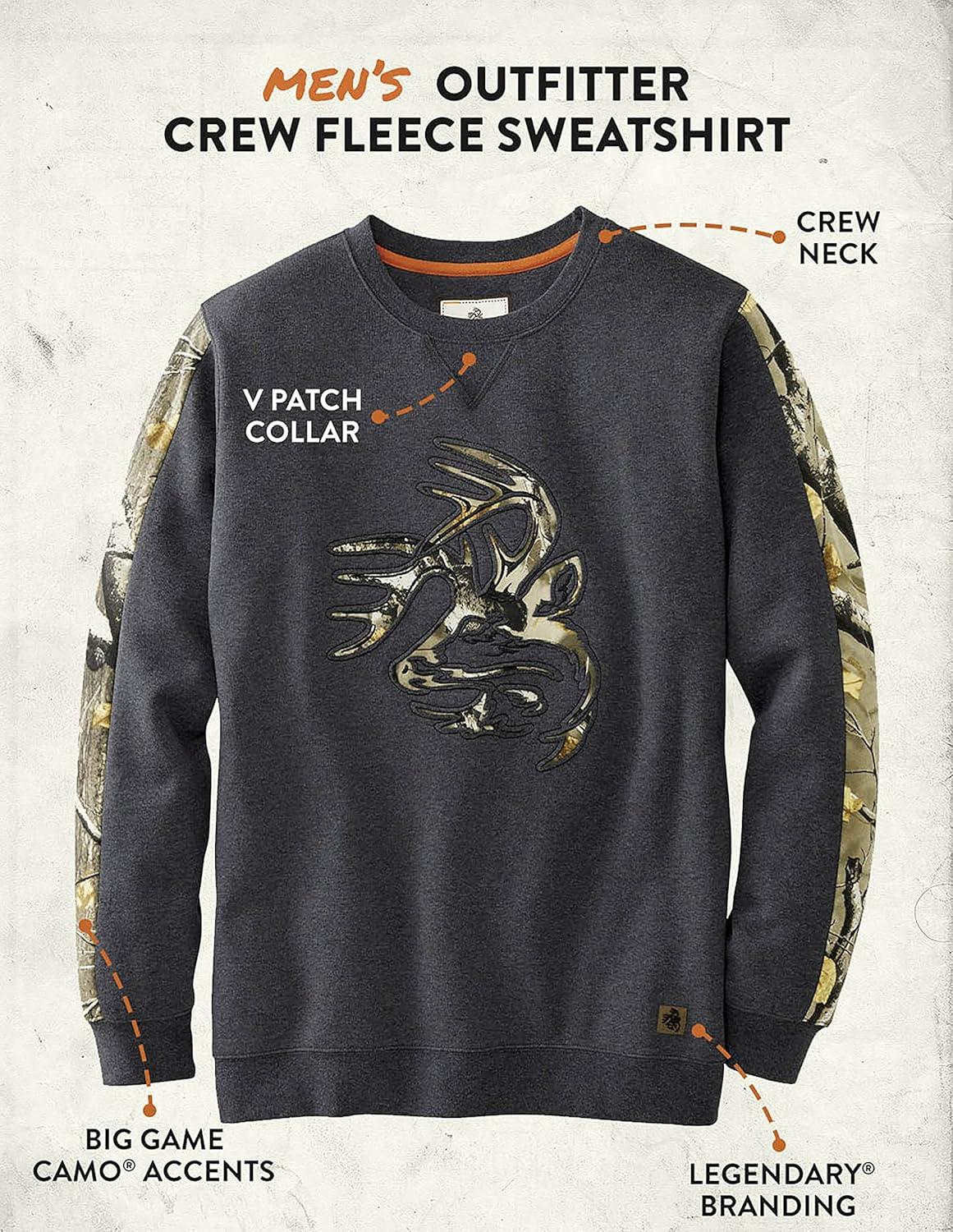 The perfect hunting crew sweatshirt has arrived! This crew neck pullover features a stylish “v” patch collar, Big Game Camo accented sleeves and Signature Buck. Completed with Legendary Whitetails embroidered branding on back yoke, and debossed Signature Buck logo faux leather patch on front.