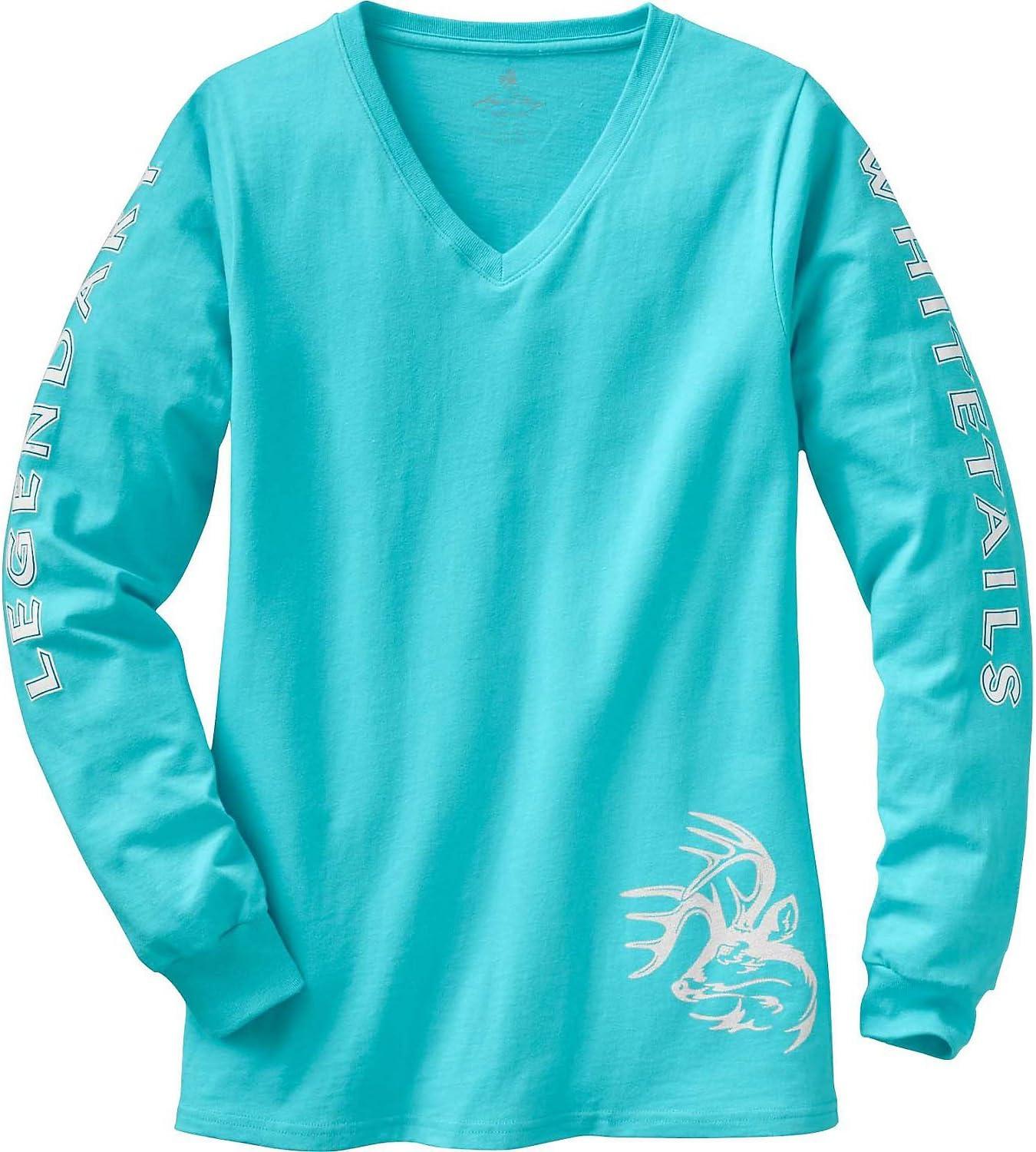 Nothing is more Legendary brand than a stylish long sleeve tee in the season's hottest colors. Made from 100% cotton, our Women’s Long Sleeve V-neck tee will keep you comfortable while you hang out with friends or run errands. Printed graphics include LEGENDARY up one sleeve and WHITETAILS down the other with our exclusive Signature Buck Logo on the hip. This stylish casual top is tagless for added comfort with ribbed cuffs. Available in a variety of colors and sizes, including plus sizing, you might find it hard to pick just one.